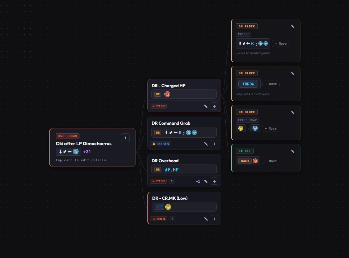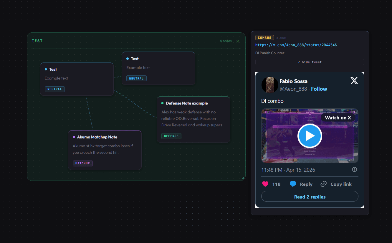 You need quick access to your knockdown options (Oki), pressure routes, combo paths, match-up notes, and practice drill ideas. The issue is that this information usually ends up spread across too many tools.