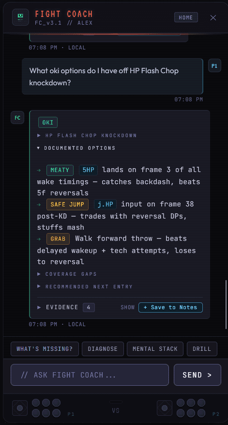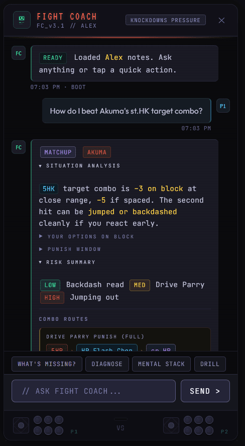 One of the most interesting parts of the project was Fight Coach, an in-app coaching feature designed around the player’s own notes and a curated game knowledge base. Rather than acting like a generic chat interface, it was built to support the actual learning workflow inside the product.