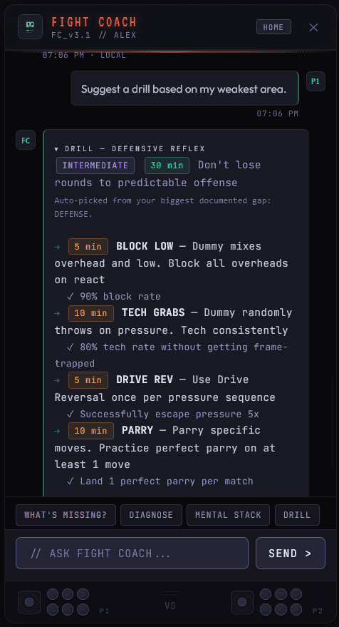 Fight Coach can help with matchup prep, highlight gaps in a player’s notes, suggest drills, explain terms, build mental stacks, and guide users through a step-by-step post-match diagnosis flow.