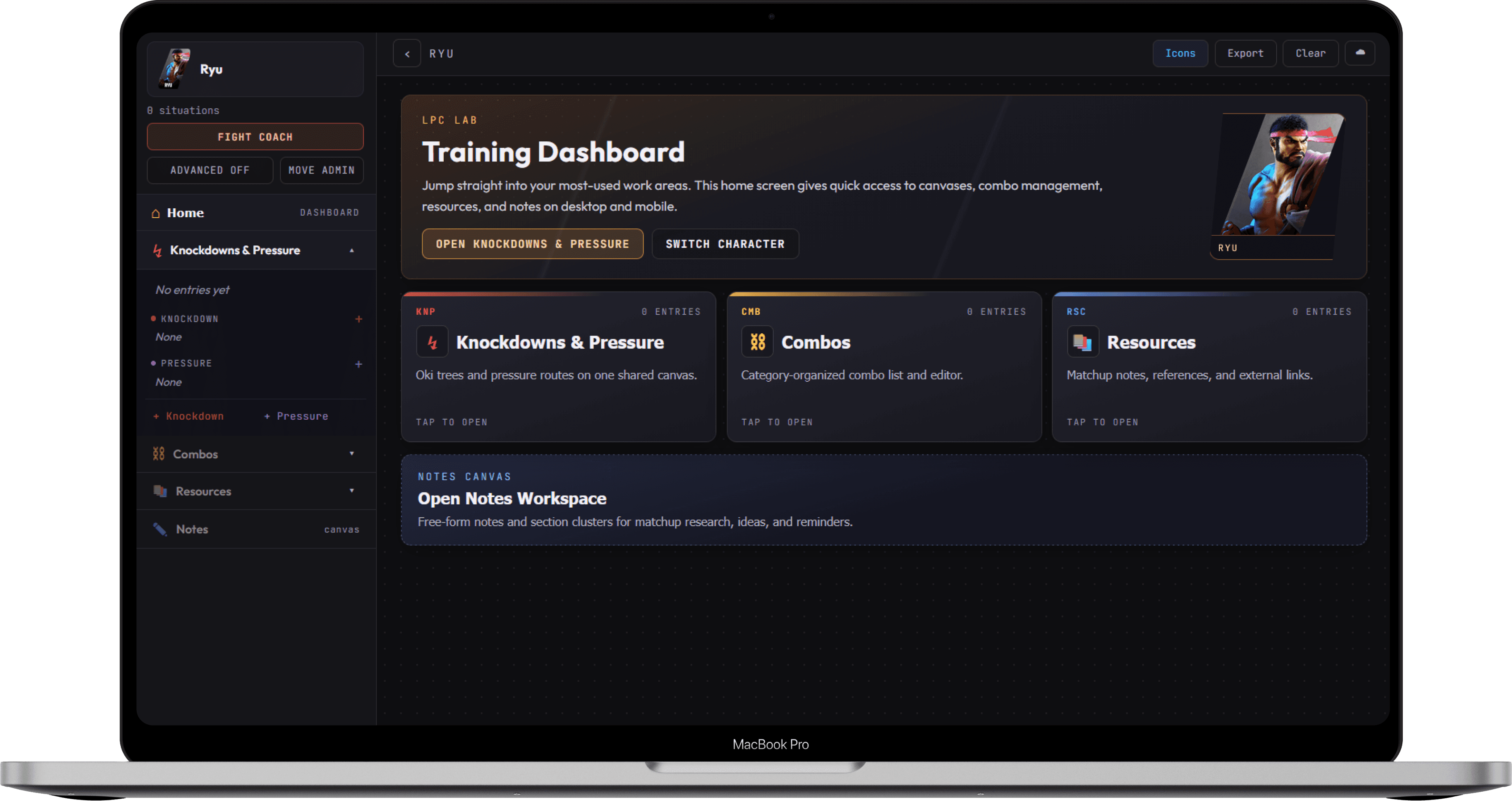 The shipped product covers four knowledge areas: Knockdowns, Combos, Resources, and Notes. The canvas layer renders automatically from structured inputs and Fight Coach runs as an integrated coaching layer throughout. It supports authentication, cloud sync, and multi-user access across devices.