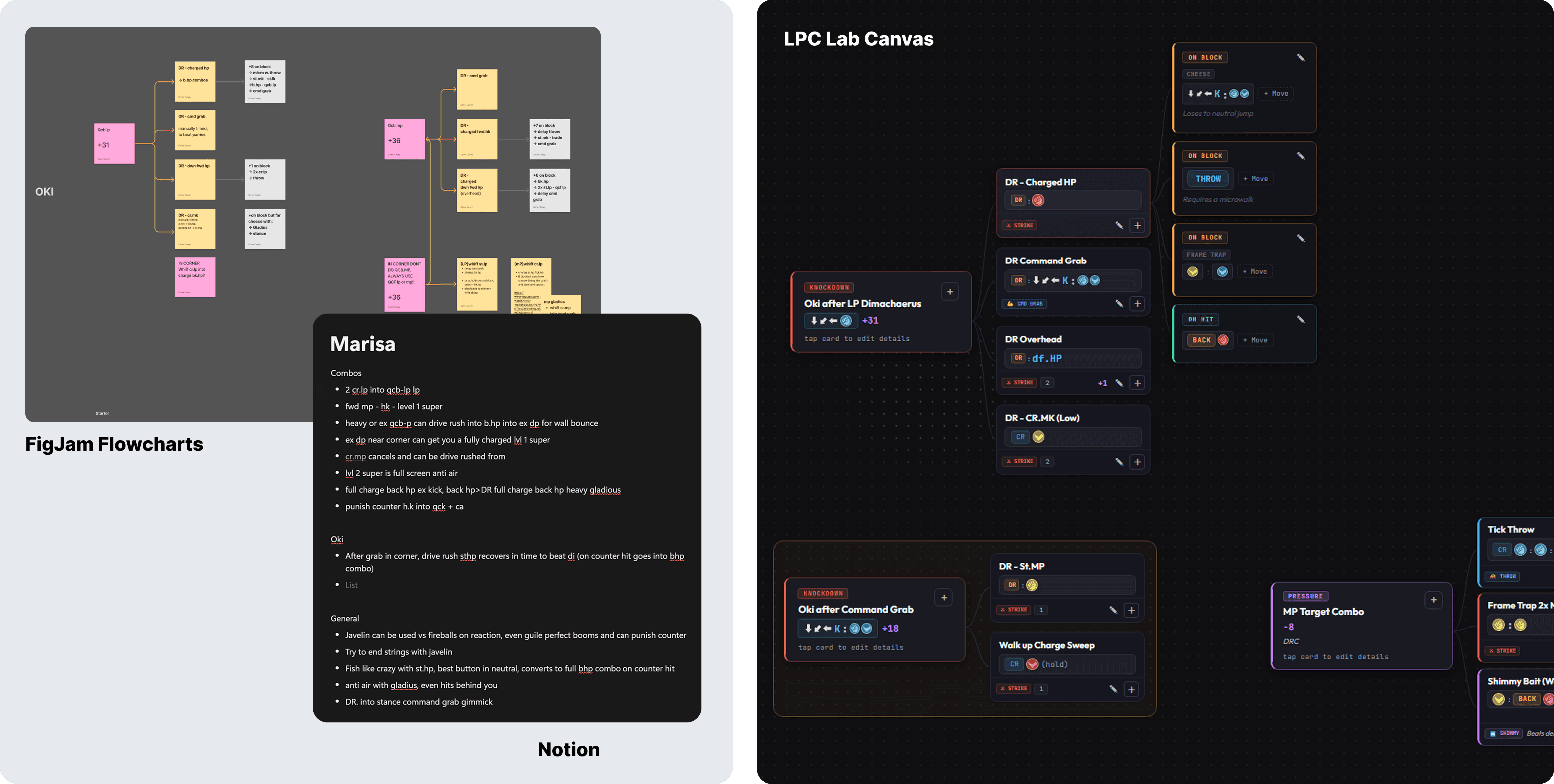 In my own workflow, Oki trees lived in FigJam and combos in Notion, with video resources and references across tabs and social media sites like Twitter. The information existed, but maintaining it was slow and awkward. Every update created more manual work, which made the whole system harder to keep current and harder to use in practice.